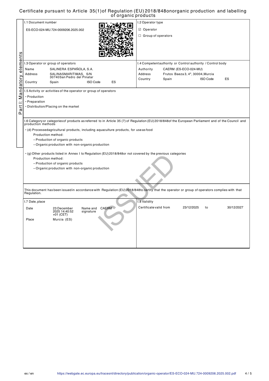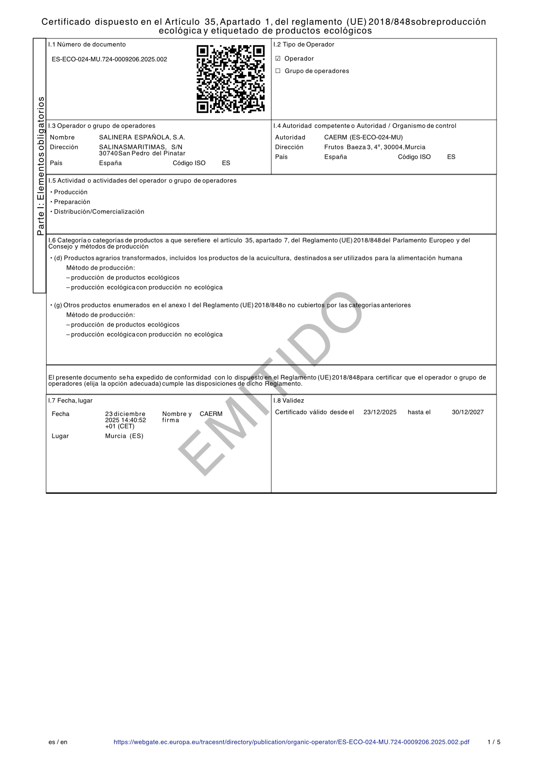 Certificado Operador Ecológico UE 2025